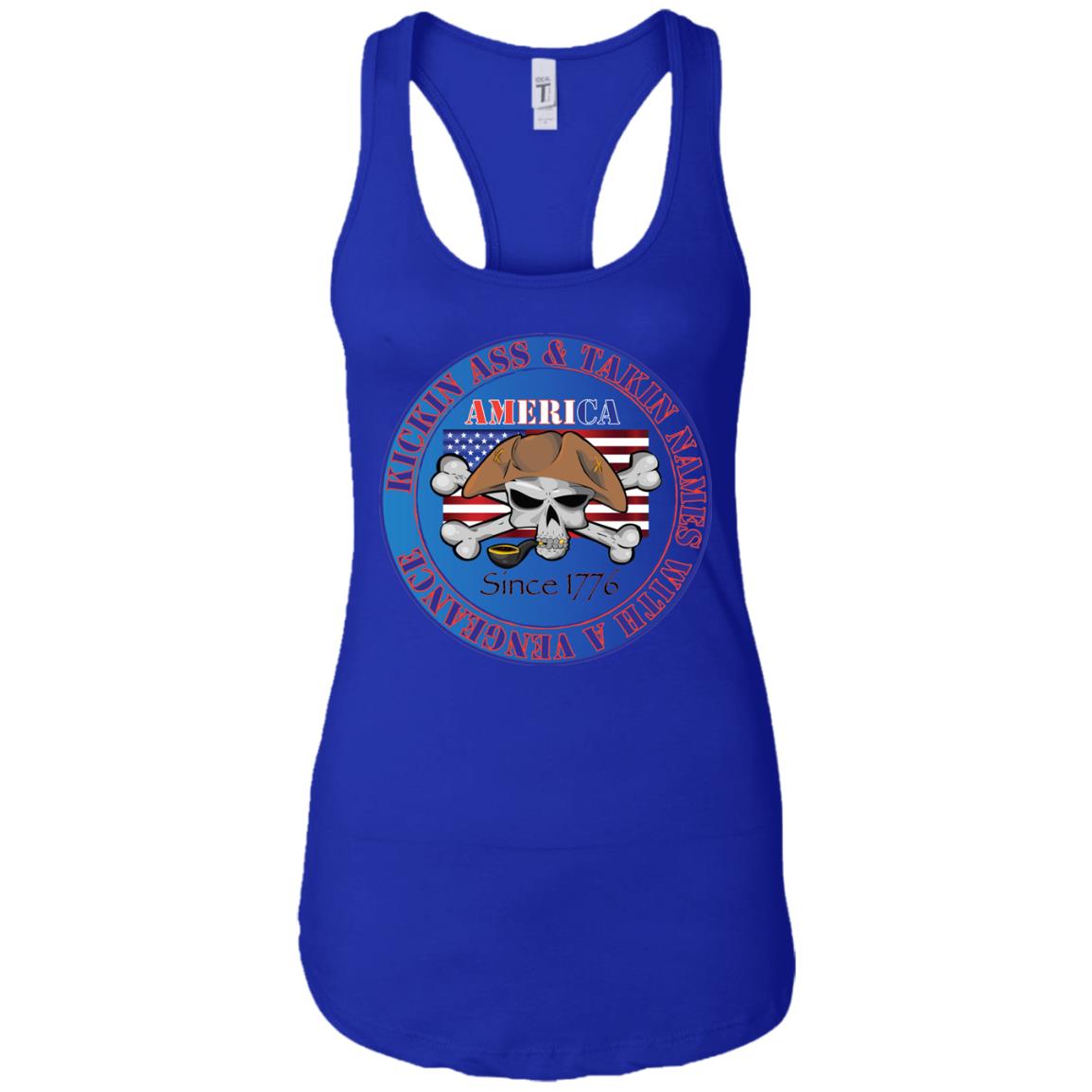 “America” - Kickin Ass Since & Takin Names With a Vengeance Since 1776 - Blue Custom Personalized Ladies' Ideal Racerback Tank